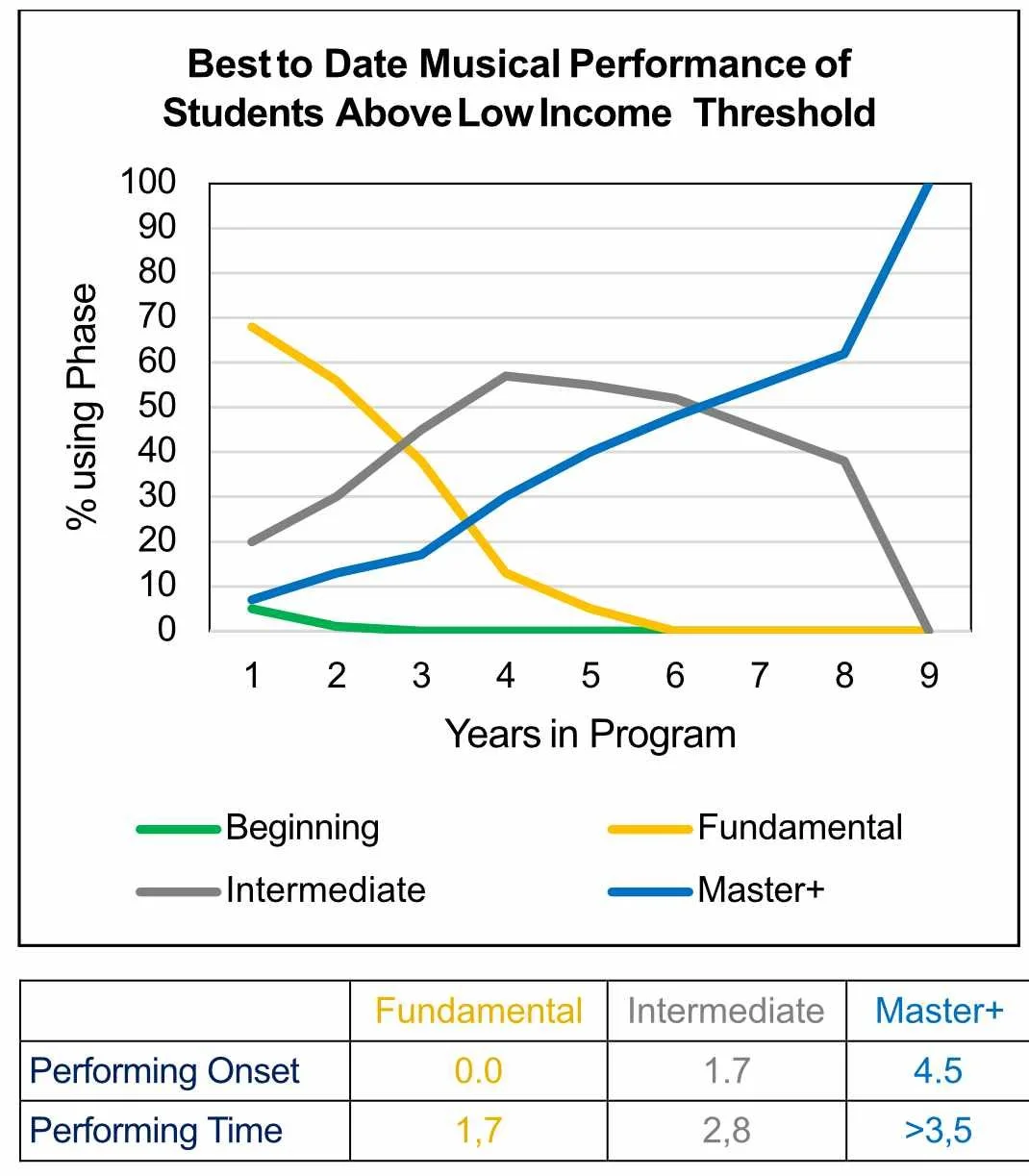 The phase chart at the left provides an example. For 9 years Soundscapes of Newport News, VA provided more than 2,500 calibrated performance ratings with 41% of children from families earning more than low income . They called the exploring phase “fundamental” and the sustaining phase “intermediate” to match current language relating to music complexity. The crossover from beginning to fundamental (green to gold) actually occurred before the first ratings were made. The performance onset for intermediate occurred at 2.8 years and lasted 3.5 years. The performance onset for master (the crossover from grey to blue), therefore, began at 6.3 years.