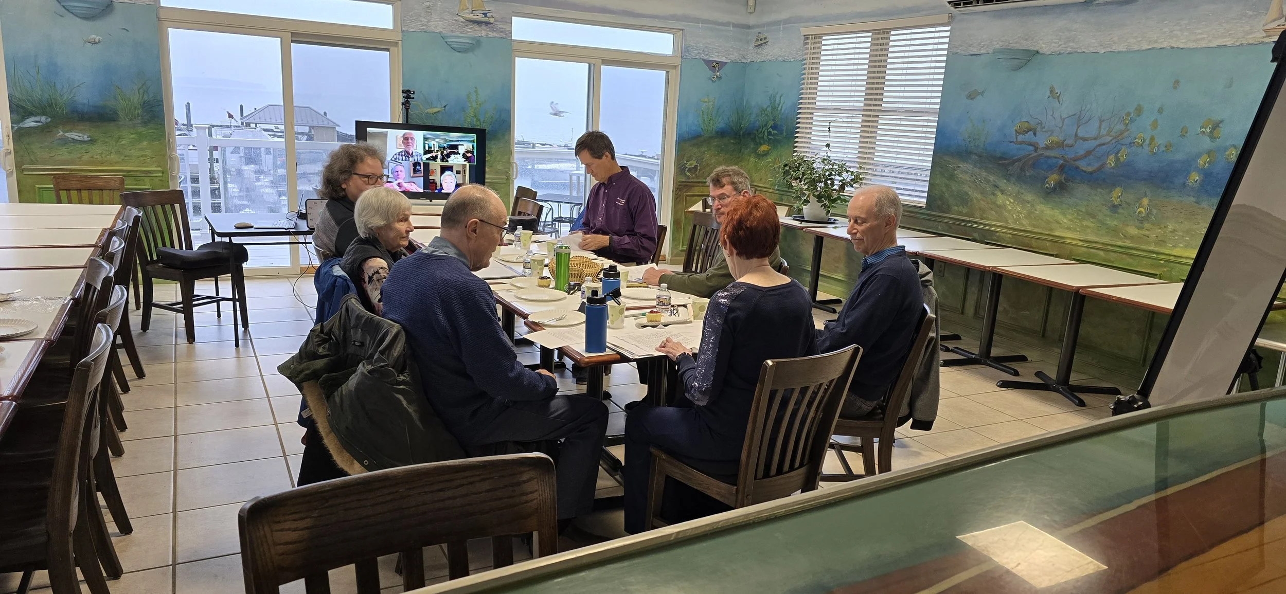 Founding Members: Counterclockwise from the table end, Sandy, Mark, Lonny, Duke, (Zoom) Judy, Michael, (continuing up the table) Barbara, Cheryl and David.